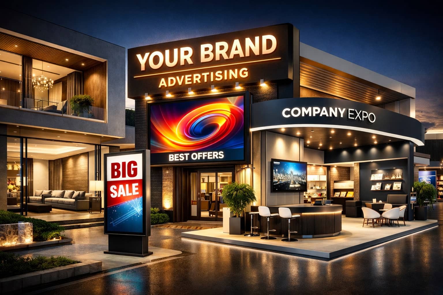 نحن B-Signs شركة سعودية رائدة متخصصة في تصميم وتنفيذ الديكورات الداخلية والخارجية، وإنتاج اللوحات الإعلانية الاحترافية، بالإضافة إلى تصميم وتجهيز البوثات والمعارض التجارية بأعلى معايير الجودة والدقة. نقدم حلولاً إبداعية ومتكاملة لواجهات المحلات، المطاعم، الكافيهات، المعارض، والأكشاك التجارية، مع التركيز على دمج الهوية البصرية مع الوظائف العملية للمساحة.